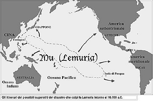 Hampir sama terkenalnya dengan Atlantis adalah hilangnya dunia Mu yang legendaris, kadang-kadang disebut Lemuria. Menurut legenda di antara banyak pulau-pulau di Pasifik, Mu adalah sebuah tempat seperti surga tropis yang terletak di suatu tempat di Pasifik yang tenggelam, bersama dengan semua penghuninya ribuan tahun yang lalu. Seperti Atlantis, ada pertentangan yang sedang berlangsung, apakah itu benar-benar ada dan jika ada, di mana? Elena Petrovna Madame Blavatsky, pendiri gerakan Theosophy di tahun 1800-an, percaya itu ada di Samudera Hindia.
